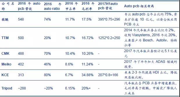 在车载PCB 领域,全球前5 名汽车PCB 制造商分别为敬鹏、TTM、CMK、Meiko 以及KCE。根据敬鹏2016 年年报,台湾敬鹏位列第一,2016 年公司实现主营业务收入7.41 亿美元,其中汽车PCB 板占比74%达5.48 亿美元,专注汽车PCB 板,全球市场份额约为11.7%,其他PCB 厂也奋起直追,台湾厂商中健鼎14Q1 公司汽车板业务占比13.2%,17Q1占比21.4%,位居全台第二,全球占比5%-6%;耀华在ADAS领域节节高升(主要是ADAS的长短距雷达板,今年有望实现倍数增长),汽车板业务占比首次超过30%。国内PCB 企业不甘落后,沪电股份表示在新产品方面,公司24GHz 汽车高频雷达用PCB 产品以及新能源汽车电池管理系统(BMS)用PCB产品已实现稳定供货。根据公司公告,目前依顿电子的汽车业务占比由2016 年的27%上升至33%,公司的毛利率水平显著提高也是系产品结构的调整,同时公司的募投项目也逐渐投产,均用来生产汽车板,未来业绩值得期待。