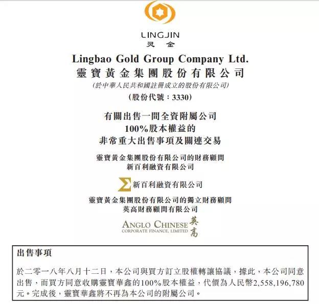 灵宝黄金(03330)公告,于2018年8月12日,公司与深圳龙电电气股份有限公司(买方)订立股权转让协议。据此,公司同意向买方出售灵宝华鑫的100%股本权益,代价为人民币25.58亿元。完成后,灵宝华鑫将不再为公司的附属公司。