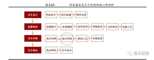 封装基板是芯片封装体的重要组成材料,主要起承载保护芯片与连接上层芯片和下层电路板作用。完整的芯片由裸芯片(晶圆片)与封装体(封装基板及固封材料、引线等)组合而成。
