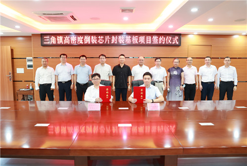 6月30日上午,三角镇高密度倒装芯片封装基板项目签约仪式在广东省中山市三角镇人民政府举行。中山市工业和信息化局二级调研员张曙,商务局副局长罗宇航,科学技术局副局长容晶,生态环境局四级调研员刘智,招商发展有限公司副总经理蒋宏恩、项目经理罗丹华,三角镇党委书记李宗,党委副书记、镇长李凯航,中山芯承半导体有限公司负责人谷新,广东达进电子有限公司法人代表郭俊豪等参加。三角镇副镇长周锦添主持仪式。