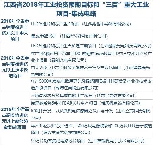 4月27日,江西省人民政府官网发布《关于印发2018年全省工业投资预期目标和“三百”重大工业项目计划的通知》,里面也有众多集成电路相关项目。