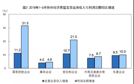 2018年1-6月份,规模以上工业企业中,国有控股企业实现利润总额10248.7亿元,同比增长31.5%;集体企业实现利润总额109.7亿元,增长4.6%;股份制企业实现利润总额24059.9亿元,增长21%;外商及港澳台商投资企业实现利润总额8197.6亿元,增长8.7%;私营企业实现利润总额8889.1亿元,增长10%。
