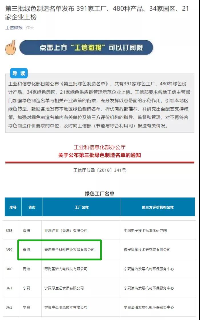 为深入贯彻落实《中国制造2025》、《工业绿色发展规划(2016-2020年)》,加快推动绿色制造体系建设,打造一批绿色制造先进典型,国家工信部开展了绿色制造体系建设示范名单推荐工作。经过专家评议、现场答辩和网上公示等环节,工业和信息化部日前公布了《第三批绿色制造名单》,诺德投资股份有限公司(简称:诺德股份)旗下子公司青海电子材料产业发展有限公司(简称:青海电子材料)成功入选国家工信部绿色制造示范名单,获批全国“绿色工厂”称号。