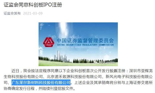 证监会发布3月9日消息,近日,证监会按法定程序同意广东莱尔新材料科技股份有限公司(下称“莱尔新材”)等4家企业的科创板首次公开发行股票注册。