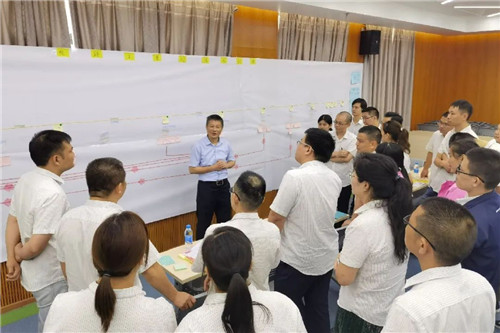 第一次绘制价值流程图的学员们略显生疏,通过周老师的耐心指点和引导,各小组不断调整优化、渐入佳境,经过数小时的努力终于完成。