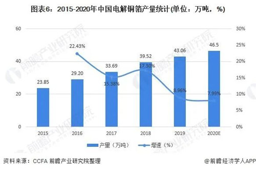 从原材料电解铜箔的供应情况来看,2015-2020年,中国电解铜箔产量逐年上升,2019年达到43.06万吨,比2018年增加了3.5万吨,年增长率为9.0%。其中,国内有13家企业的年产量达到1万吨以上规模。2020年,根据各企业新增产能及市场需求情况,初步测算我国电解铜箔产量达到46.5万吨,同比增长7.99%。